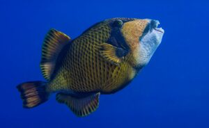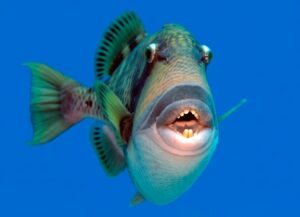 El TITAN TRIGGER FISH, o pez ballesta Titán; un pez bastante grande, con unos dientes que ríete tú del Tyranosaurios Rex. He visto un agujero de lado a lado en una aleta Jet Fin, las más gordas que existen, provocado por uno de sus mordiscos. Evidente, si en vez del plástico te pilla un dedo o un trozo de carne, pues, no te va a matar, pero vas a tener un bonito recuerdo para tu vida, porque el buen tajo te lo llevas.