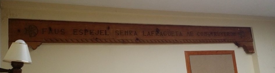 Si recuerdo con tanta exactitud los nombres de todos, aún datando de 1985, no es porque yo tenga excelente memoria, sino porque quedaron casi tatuados en mis recuerdos, a base de verlo escrito en madera sobre mi cabeza: en una de las genialidades de todo ese gran equipo, se les ocurrió grabar textos en unas enormes vigas de madera estratégicamente situadas, mezcla decoración y función. La primera, en la entrada principal, sobre una rueda de molino a los pies rellena de pequeñas piedrecidtas que pusimos una a una durante varios días toda la familia, donde constaba un «latinajo» que agradecía el paso de los viandantes bajo su jacena. La segunda, un poco más dentro, rezaba precisamente «Faus, Espejel, Senra y Lafragüeta me construyeron», dejando así legado de los artífices de la construcción.