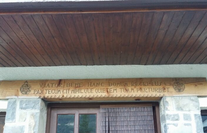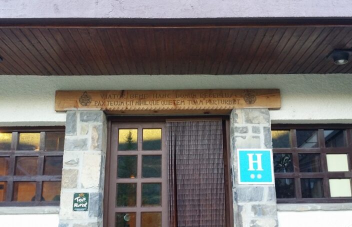 Estaba -y creo que sigue estando, pero ahora como albergue, si no me equivoco- en Villanúa, un pequeño pueblo del Pirineo Aragonés, a mitad de camino entre Jaca y Candanchú, a los pies de la Collarada destacando esa balconada y enorme genciana en los laterales a la vista de todos, transeúntes y visitantes.