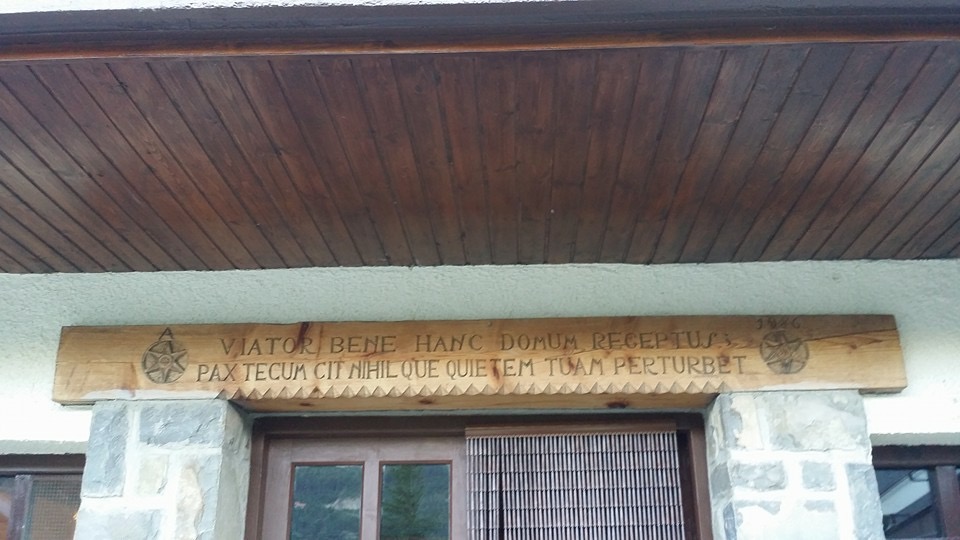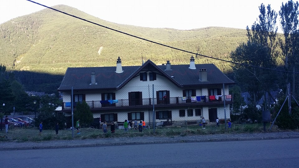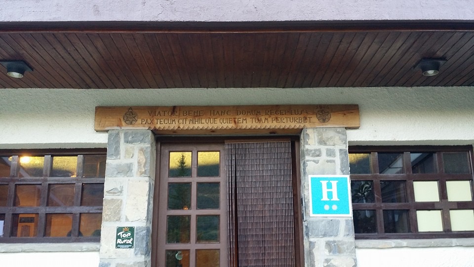 Estaba -y creo que sigue estando, pero ahora como albergue, si no me equivoco- en Villanúa, un pequeño pueblo del Pirineo Aragonés, a mitad de camino entre Jaca y Candanchú, a los pies de la Collarada destacando esa balconada y enorme genciana en los laterales a la vista de todos, transeúntes y visitantes.